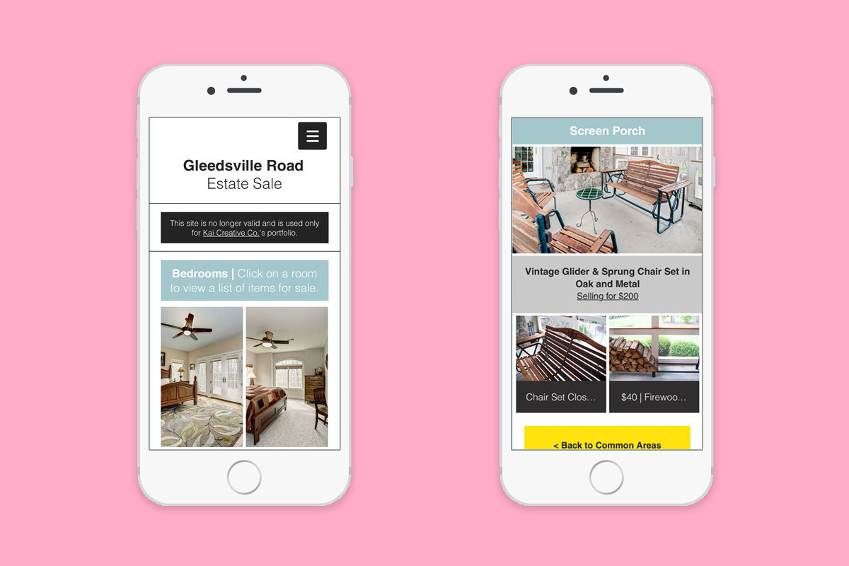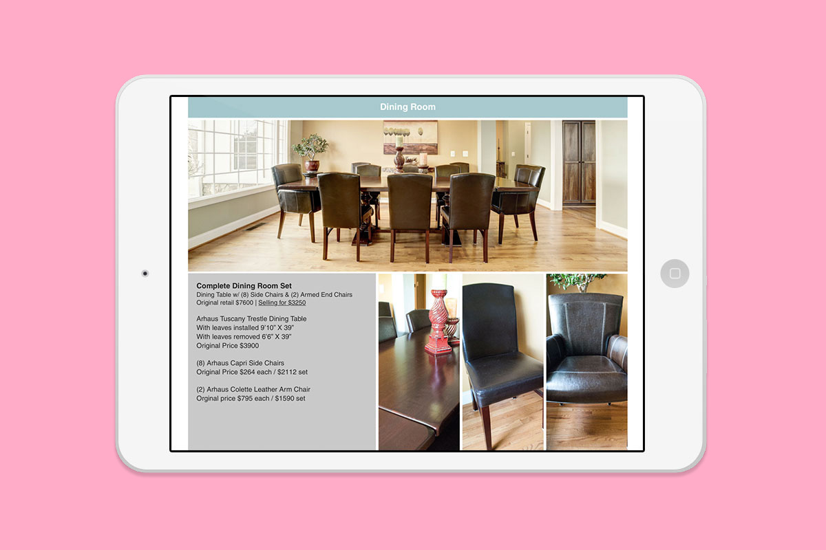 With professional estate sale companies encouraging big crowds to drive sales and taking 40-50% of the profit, a client hired us to come up with a cost-effective, none-intrusive way to showcase the contents of his estate sale in Leesburg, VA. Our solution was to take photographs and strategically list the items for sale in a free temporary website. Those interested in buying could email our client and make an appointment, which made it convenient and hassle-free.